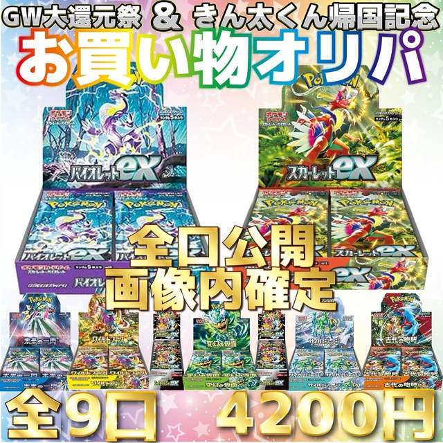 9口限 BOX確定【お買い物オリパ】ラッキー賞 #PKB買物04 ※完売後公開抽選ののち発送となりますので、完売するまで出荷をお待ちいただきます。 ご理解いただいた上で購入をお願いいたしますm(__)m  スマキンオーナーのきん太くんです!!! どうせBOX買うならスマキンのお買い物オリパ!!!! ハズレてもただのお買い物~♪♪♪ クーポン使うとただの特売品~♪♪♪ 1口・・・4200円 口数・・・9口 購入制限・・・おひとり様3口まで  番号選択式 ☆他オリパを1口ずつ購入することをおすすめしています!  ラッキー賞の恩恵がもちろんそれぞれでうけれます!!! 保証レベル:お買い物♪ 【ラインナップ】※A賞はありません。 B賞 ●バイオレットex1BOX(BOXローダー付) 1枠   ●スカーレットex1BOX(BOXローダー付) 1枠 ハズレ●1BOX(BOXローダー付) 7枠 ラッキー賞●LUCKYカード のみ 1枠     ハズレ枠から1/7抽選 ※全て未開封シュリンク付きです! ※パックの中身についての否定的な評価・レビューはお控えください。 【完売後公開抽選方式】 ・商品購入画面で選択する番号がそのまま抽選番号となります ・完売後すべての支払いが確認できた後に XアカウントにてB賞の抽選とラッキー賞の抽選を公開  Xアカウント:@smakin_oripa #スマキンオリパ    https://twitter.com/smakin_oripa         #PKB買物03←X(旧Twitter)でこちらを検索で抽選結果を確認できます。 ※到着まで楽しみにしたい方は抽選結果を見ないことをおすすめしますm(__)m ☆到着報告でクーポンをプレゼント☆期限5月31日 【到着報告投稿クーポン獲得条件】 X(旧Twitter)で到着報告の投稿で当店で使えるクーポンをプレゼントいたします。 ●ハッシュタグに「#スマキンショップ」をつけて投稿をお願いします。 S賞・A賞・LUCKY賞の当たり報告でもれなくクーポン1000円プレゼント! ※今回はS賞・A賞はありません。 ハズレても抽選で1000円クーポンが当たる!!! ※1商品に対して1クーポンまでです。複数種類商品購入した場合はすべての投稿で×商品数分抽選又は大当たりの場合はその報告の数だけクーポン差し上げます。 まとめて1投稿でOKですが、わかるようにDMお願いしますm(__)m ●クーポンはXのDMにてお渡しいたしますので必ずX(旧Twitter)に投稿をお願いします。 ●投稿の際は同封のスマキンとわかるものと商品を一緒に撮影お願いします。 ●オリパ購入履歴の分かるスクショとX投稿をスクショし、@smakin_oripaに画像を必ずDMお願いします。DMいただかないと気づかない場合がありますのでm(__)m ※完売後公開抽選ののちに発送となりますが商品の開封するタイミングに個々差がありますので、配慮いただいて少し時期をズラして投稿をお願いいたしますm(__)m とってもお手数おかけしますが宜しくお願い致しますm(__)m ↓↓↓必ず読んでからご購入下さい↓↓↓ 【注意事項】 〇完売後入金の無い場合でも完売から一日後に抽選と発送を行わせていただきます。 〇購入後2日入金の無い場合はキャンセルさせていただきますのでご了承下さい。 〇購入後の返品・返金は下記の場合を除き対応しておりません。 ・BOXの封入率に異常があった場合は返品・交換対応いたしますが、荷物の開封からパックすべての開封のノーカット動画をご提出お願いいたします。 〇商品は予告なく販売終了、お値下げをする場合がございます。 〇発送は基本クリックポスト・コンパクト便・宅配便 400円 〇口数が多い場合やBOXなど大きい商品の場合は上記価格で適切な運送便にて配送いたします。 〇配送に不安のある方は宅配便を選択お願いします。 〇発送は商品が完売した後、1〜5日以内を心がけておりますが、場合によっては1,2週間かかる場合がございますのでご了承下さい。 ◯同一商品を同一日に複数個ご購入頂いた場合、まとめて発送させていただく場合がございます。その為、送料が二重に発生してしまうことがある旨、ご承知ください。 また、発送を別々に分けたい場合にはお手数ではございますが、ご購入時にご連絡ください。 〇郵送事故に関しましては保証いたしかねますが、可能な限り発送業者さまと連携し誠意をもって対応致します。 〇発送通知があったにも関わらずお品物が届かない等何かありましたらお手数ですが当店までメールまたはメッセージをお願いいたし 〇オリパの性質上運送便の種類により当選商品が推測される恐れがあり楽しみが損なわれているため基本出荷方法と運送番号のご連絡は致しません。希望があればショップのお問い合わせまたはXにてDMをお願いいたします。その際商品名、注文番号を教えてください。 〇価格は様々なカードショップやフリマサイトの購入価格を参考にさせていただいております。 ◯当たりのラインナップは作成当時の相場を参考に作成しています。購入後、商品到着時と制作時で相場が変動している可能性がございますので予めご了承下さい。 〇基本的には鑑定品BOX又は店舗で購入したBOX、他社購入品、他社オリパ品、買取品、自社仕入れ品、きん太くんコレクションまたは社員
